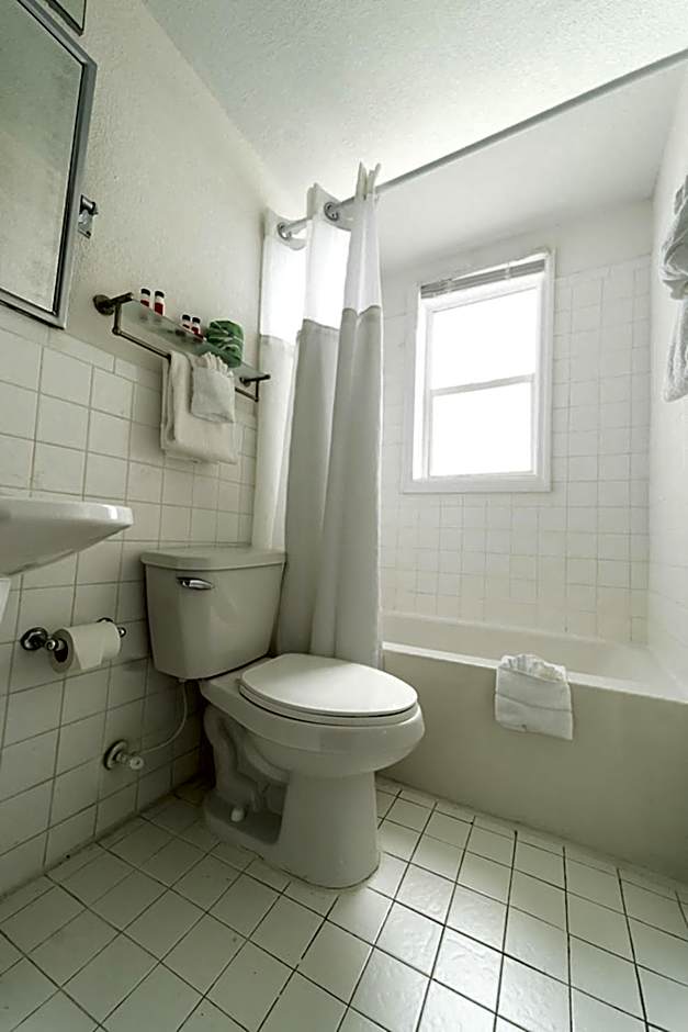 This guestroom features a safety deposit box, small refrigerator and a private bathroom.